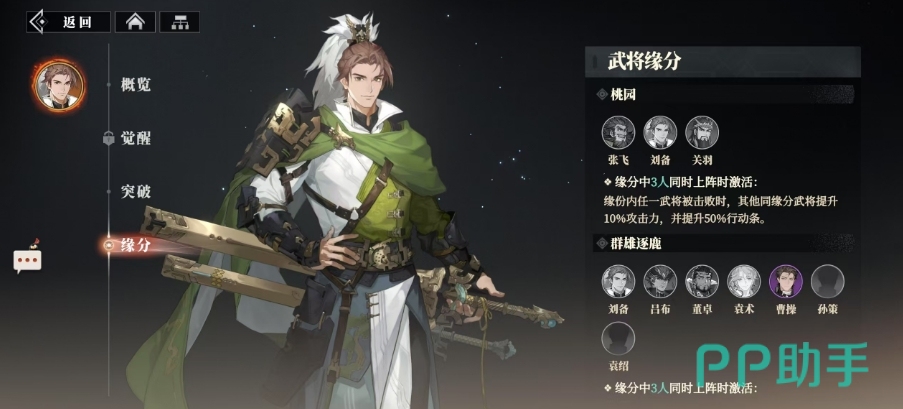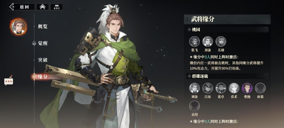 提及刘备,不得不提桃园结义羁绊的效果,当张飞、关羽与刘备在同一个阵容的时候,一旦其中一人不幸败亡,幸存的两人会有攻击力瞬间飙升10%,行动条激增50%的增益,而群雄逐鹿的羁绊,则将刘备与董卓、袁术、曹操等枭雄并列,构建了一个跨越阵营的联盟,在这个联盟中每增加一位同缘武将,己方的优势就会有伤害与防御同步提升2%的效果。