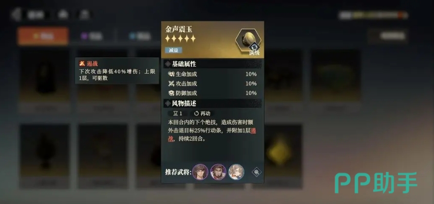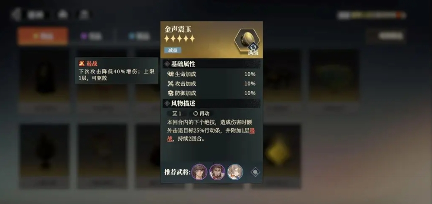 张飞建议携带金声震玉,以其初始104的高速,先手施放大招,对敌方全体造成推条效果,并降低最高70%的增伤,有这样的装备搭配,这个阵容在PVP战斗中只要玩家之间的属性差距较小,血量上限也不高,阵容中的关羽秒杀效果就更容易触发,一旦滚起雪球,便很难被对手逆转,而在PVE战斗中,面对单体BOSS关卡,张郃的三重破防机制能够大幅降低BOSS的减伤,让关羽能够打出极高的伤害。