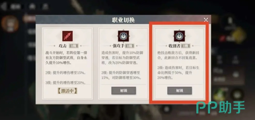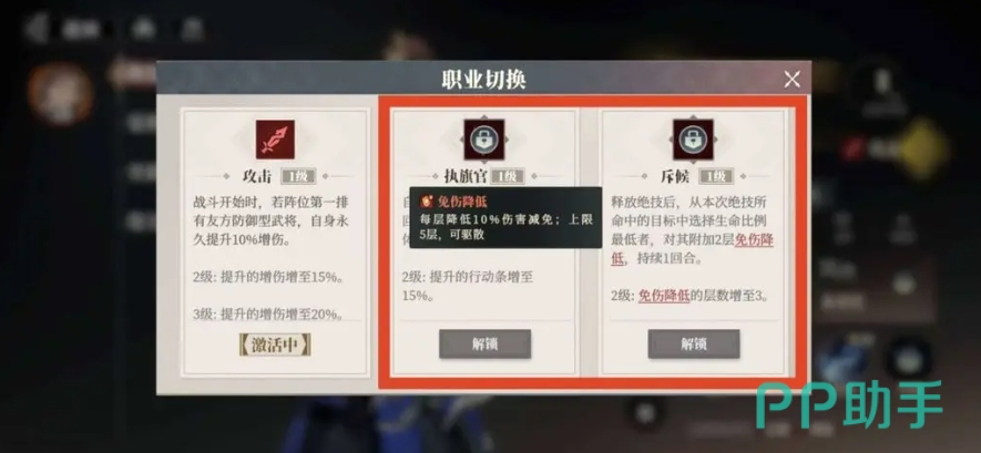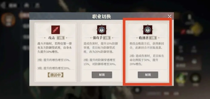而张郃可以转职为斥候,这样则能在关羽之前施放大招,不仅触发了自身的天赋降免伤25%,还能额外获得斥候职业的30%降免伤,两重降免伤叠加,极大地提升了关羽的伤害输出,让关羽的每一次攻击都如致命一击,还有张飞可以转职为战狂,将防御的50%转化为攻击,让他在战场上既能抗又能打,刘备则是转职为将军,通过普攻邀战主C进行额外攻击,不仅提升了队伍的输出能力,还进一步强化了与关羽的连携效果。