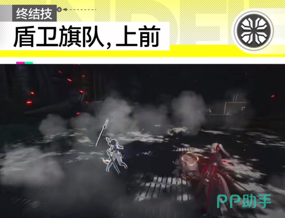终结技【盾卫旗队,上前!】可召唤一名盾卫协同作战。当敌方目标处于物理异常状态或被骏卫的连携技命中时,盾卫将自动进入攻击模式,对其造成额外伤害并协助恢复技力,强化整体作战节奏。