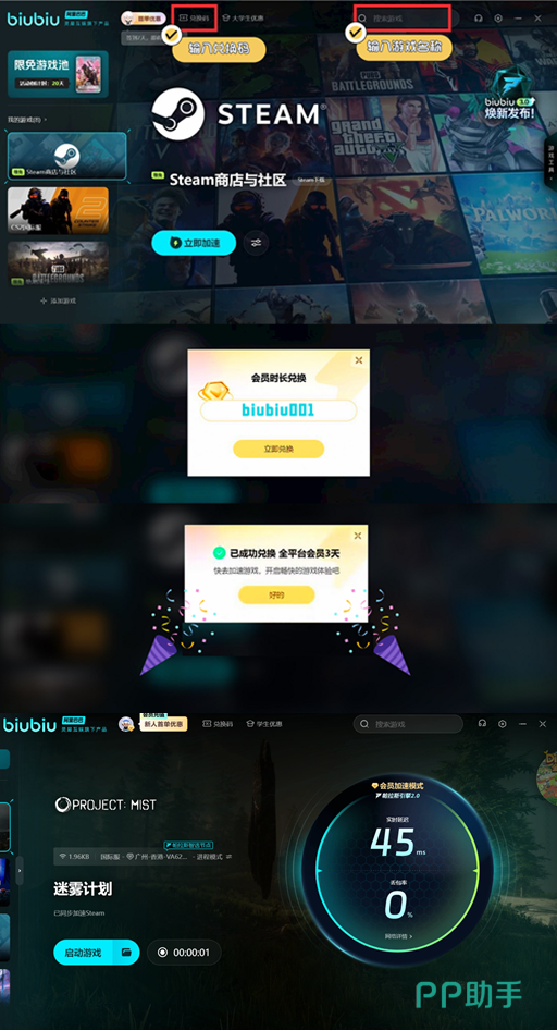 如果在体验游戏时遇到黑屏闪退或者是延迟卡顿等一系列现象,绝大部分情况都和网络的速度有关。遇到这类的情况就可以选择加速器,可以解决网络高延迟,还有卡顿等问题。新用户在点击上链接之后,就可以拥有一个24小时的免费加速时长。使用兑换码【biubiu001】还可以额外的解锁3天免费加速时长。把两种方法叠加在一起,就可以免费长达96小时。