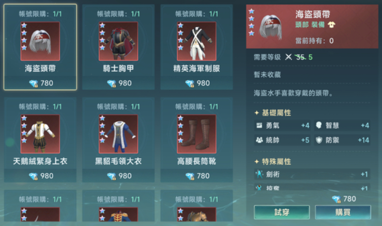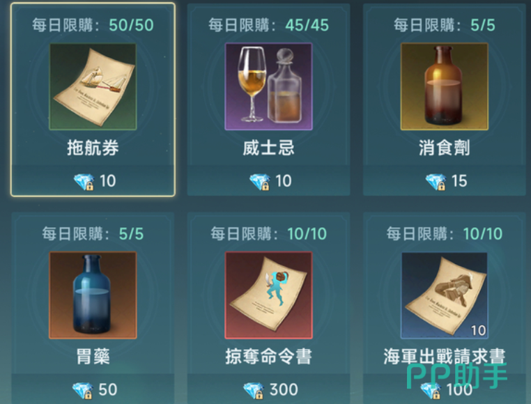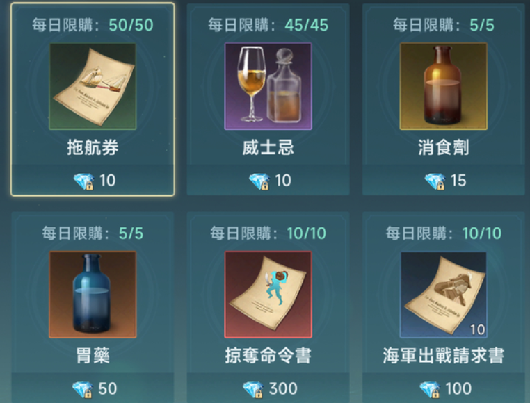 另外在游戏里还有作战指令书,这是提升战斗效率的道具,有了指令书之后还能缩短海战的时间,玩家能节约更多的时间在探索和贸易上,要想让战斗更加游刃有余的话,可以选择购买这些指令书,有海战指令书和陆战指令书这两种,可以根据自己的需求在游戏里购买,另外在游戏里还需要购买消食剂和胃药,消食剂可以帮助玩家提升自己的行动次数,为药能维持较高的行动力,胃药50钻石一个,每天限购5个,消食剂15钻石一个,每天也是限购5个。