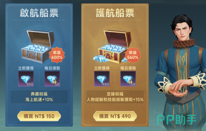 想要在游戏里氪金,那首选的就是月卡,在这个游戏里会设定两种月卡,一种月卡能增加航行速度,另外一种是能增加经验获取的月卡,购买月卡之后,不但可以每天都领取相应数量的钻石,I另外在游戏里还能获得特定的经验加成,大家可以根据自己的需求选择不同的月卡购买,另外,还可以通过在游戏里购买祝福叠加,提升特定的经验,就比如游戏里可以直接花费3000钻石,购买三种祝福,分别是风神,雷神和海神三种祝福,这几种祝福能让人物经验,技能经验得到提升。