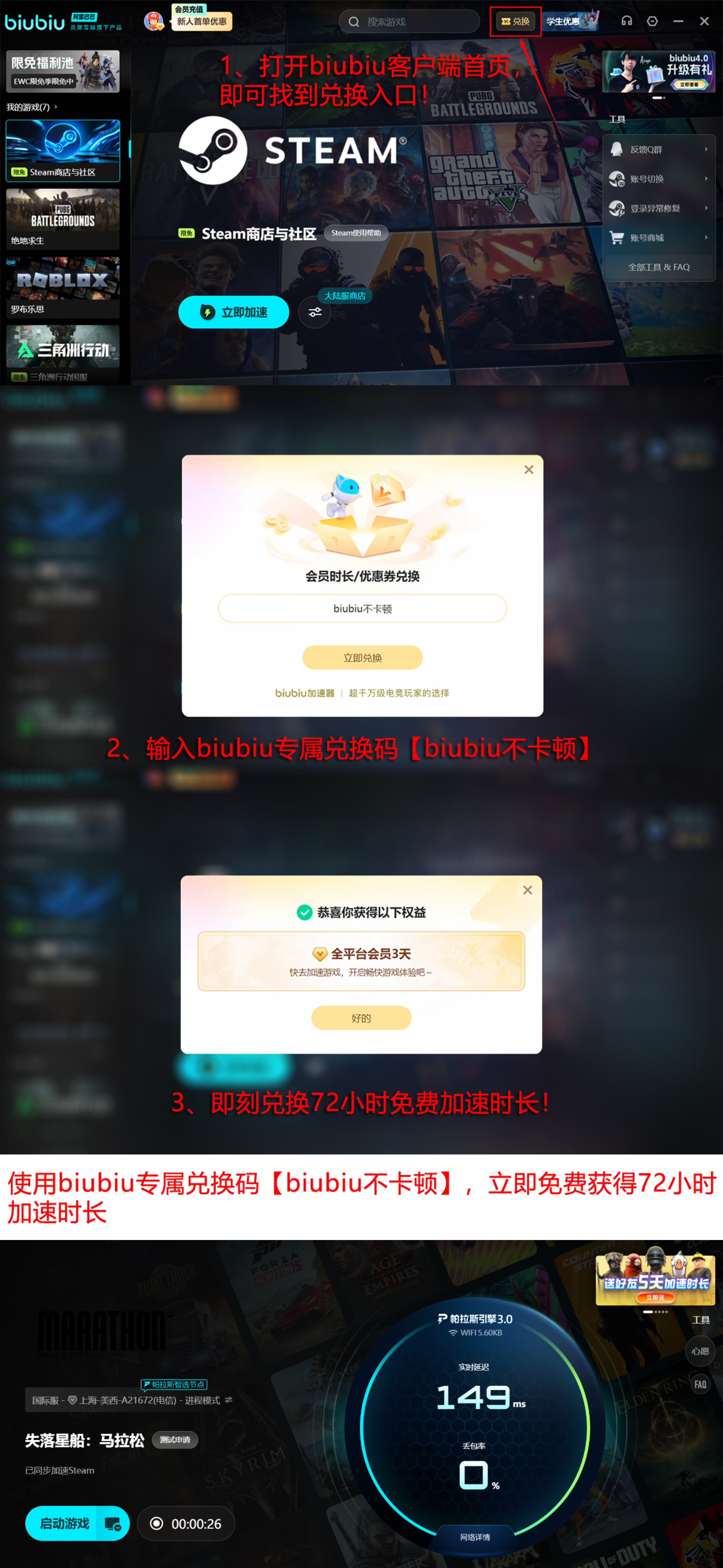 biubiu加速器现面向全体用户提供限时福利:新注册用户可直接领取24小时免费加速时长;所有用户(含新老)输入口令【biubiu不卡顿】即可激活连续3天高级加速服务。