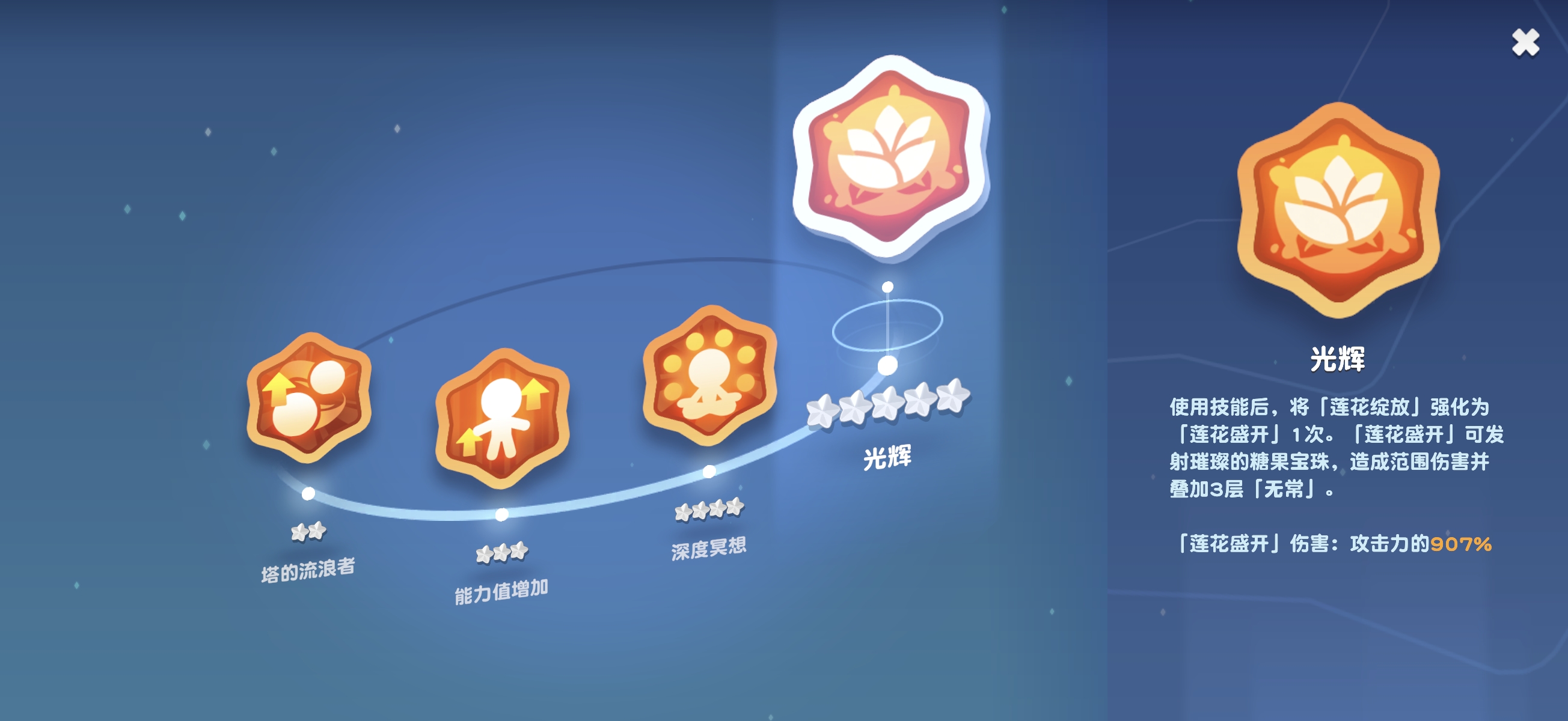 实战中需注意技能释放节奏:优先通过普攻叠加“烦恼”,再衔接特殊技能或绝招,方可最大化伤害收益。角色升阶后,特殊技能基础伤害获得额外增幅;达成五星品质后,“莲花绽放”技能将进化为“莲花盛开”,不仅提升范围伤害强度,更可直接赋予目标3层无常效果,显著加快减防节奏,在高强度对抗中建立先手优势。