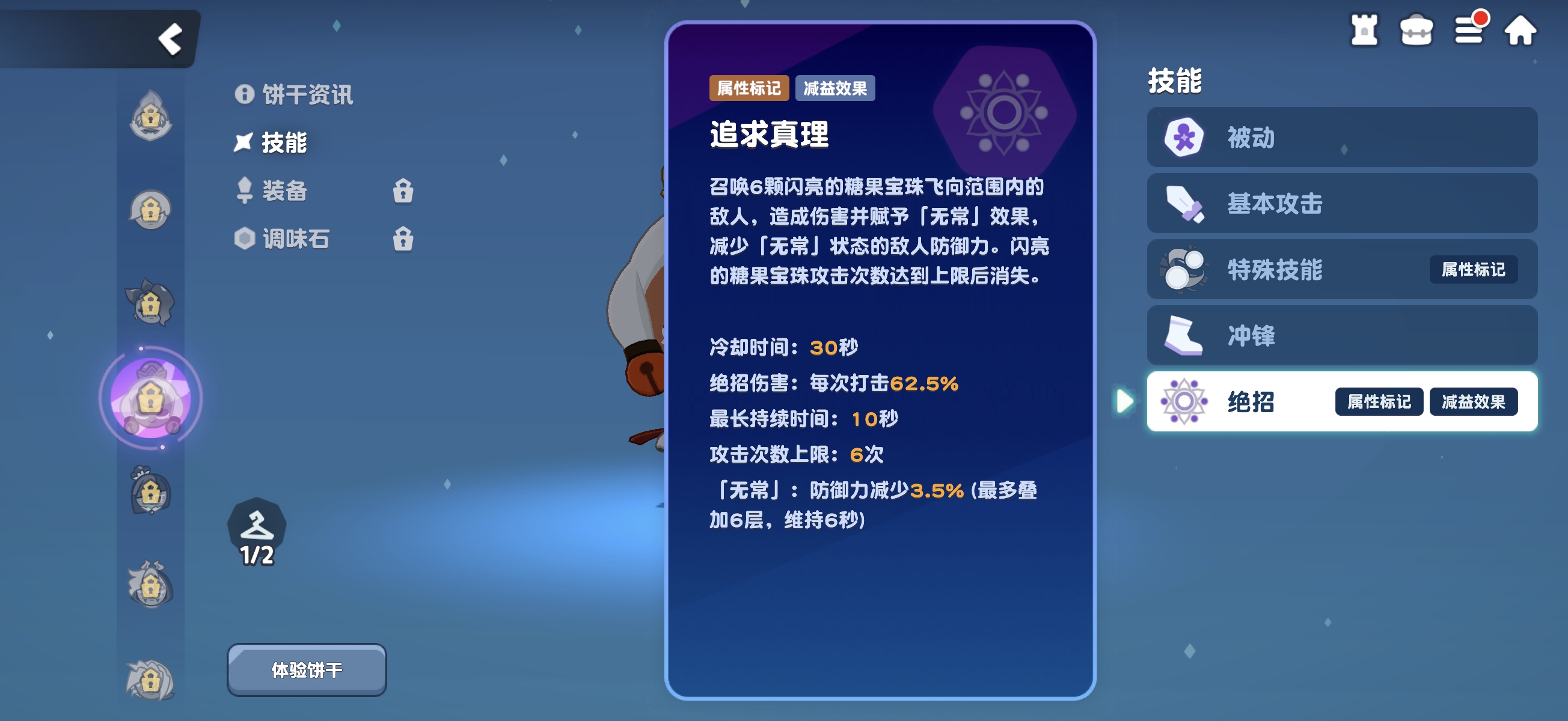 基础普攻为投射单颗糖果宝珠,长按可进入蓄力模式,实现多段连续发射。特殊技能生成持续3.8秒的范围伤害区域,适用于地形受限场景以提升命中率。其终极技能“甜蜜风暴”可召唤6颗糖果宝珠,对范围内敌人造成伤害并附加“无常”减防效果:每层降低目标3.5%防御力,最高叠加6层,持续6秒。满层状态下总计削减21%防御,大幅强化队伍整体输出效率,是该角色战术价值的核心所在。