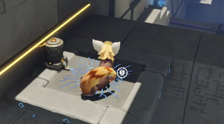门开启后进入第二区域,需指定队伍中具备电属性的伊莫角色靠近中央激活装置。保持伊莫处于有效作用范围内即可自动触发,无需额外操作。随后平台将从远处匀速驶来,待其完全停稳于面前时跳跃登台。