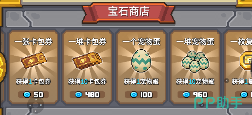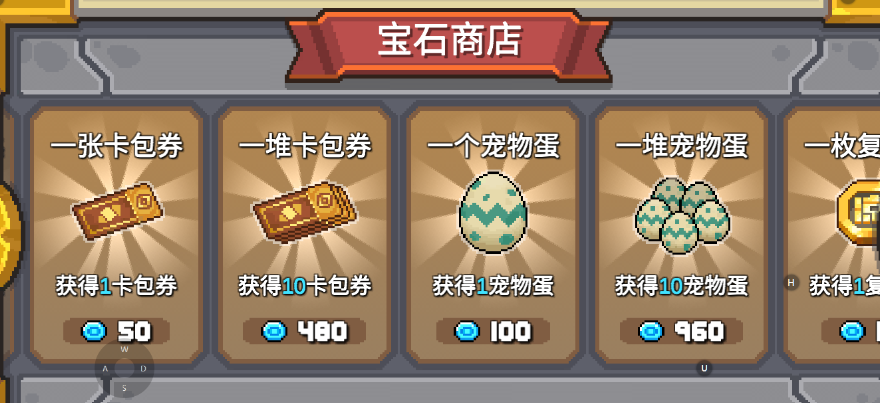有四款时装是可以使用200个蓝宝石来购买的,还是比较划算的!在神秘商人旁边还会刷新宠物商人,宠物商人的话,是需要玩家们使用蓝宝石来进行购买宠物蛋!还可以直接在宝石商店中,购买卡包卷!