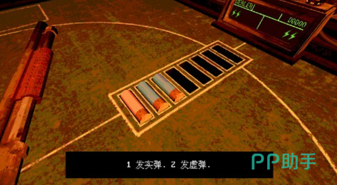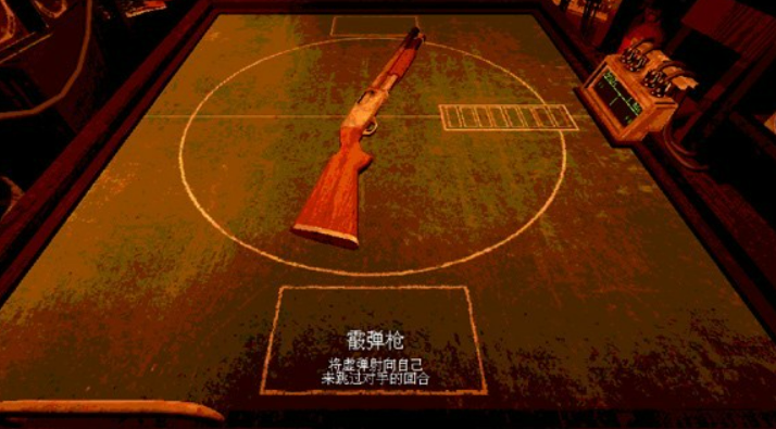 每局开始,玩家与对手(恶魔)分坐于幽闭房间两侧,中央放置一把六发转轮霰弹枪。恶魔会随机装填实弹与空包弹,初始轮次通常为1发实弹+2发空包弹;随关卡推进,实弹数量逐步增加,最高可达4发实弹+2发空包弹。装填完毕后,双方轮流执行行动:可选择向对方开枪,亦可选择向自己开枪——这一设计构成整局策略支点。