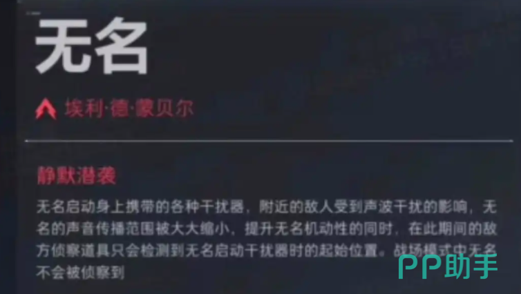 角色除了优秀的战术道具之外,自身还会带有名叫寂静无声的战术装备,这个装备其实就是干扰器,角色出现的地方,附近的敌人都会受到声波的影响,一旦受到影响之后,使用其他的道具也没有办法侦察出这个角色所在的位置,非常适合在游戏过程中记住这个角色,突进到对方的领地范围,不用担心因为产生声波造成角色位置暴露。