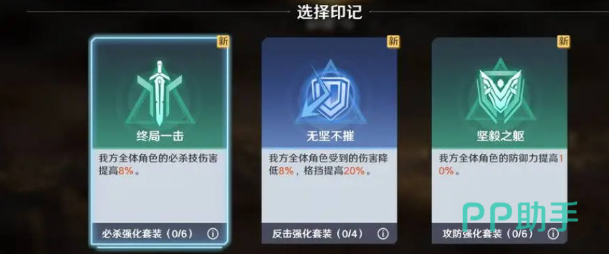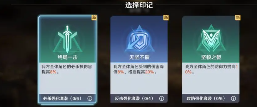每次战胜敌人后,系统会提供三种印记供选择其一进行继承。例如“坚毅之躯”可使全体我方单位防御力提高10%,“终局一杀”则提升全队必杀技伤害8%。这些增益仅在当前副本周期内生效,但能显著强化作战表现,为突破高难度节点提供有力支持。