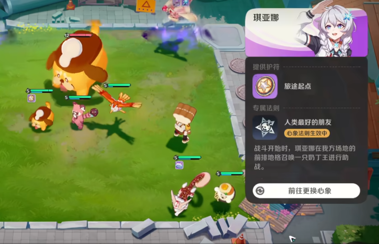 琪亚娜的专属护符名为“旅途起点”,提供固定35点护甲与35点魔抗,并额外提升生命值上限——提升量等于自身护甲与魔抗数值之和。该效果虽不炫目,却在等级压制明显的前期形成扎实防御缓冲,尤其适配前排承伤或核心输出位的早期生存需求。而其专属法则“人类最好的朋友”,则在战斗开始时于我方前排地格召唤一只奶丁王。该召唤单位不占用精灵人口上限,且属性为常规奶丁汪的约两倍,属于纯增益型战力补足。