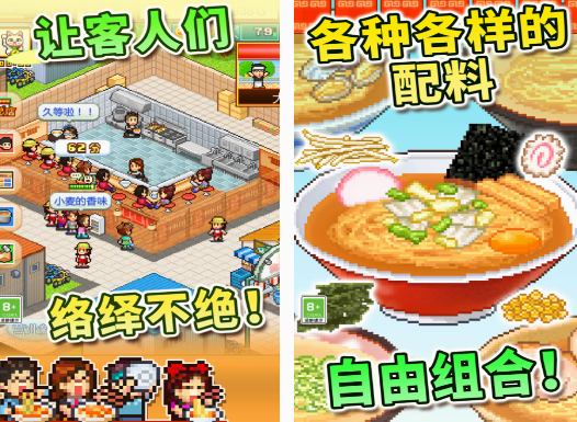 由于本身的开罗拉面店,它属于在日本非常火爆的游戏,所以为了吸引国内的玩家,也推出了这款汉化版本的,里面无论是文字内容,还是各方面都是大家比较熟悉的。身为经营者的你,不仅需要做好店面的升级,还要开发新的菜单,做好店面扩张的准备,只有客人络绎不绝的情况下,才能让你的生意越来越好,也支持与竞争对手进行较量。