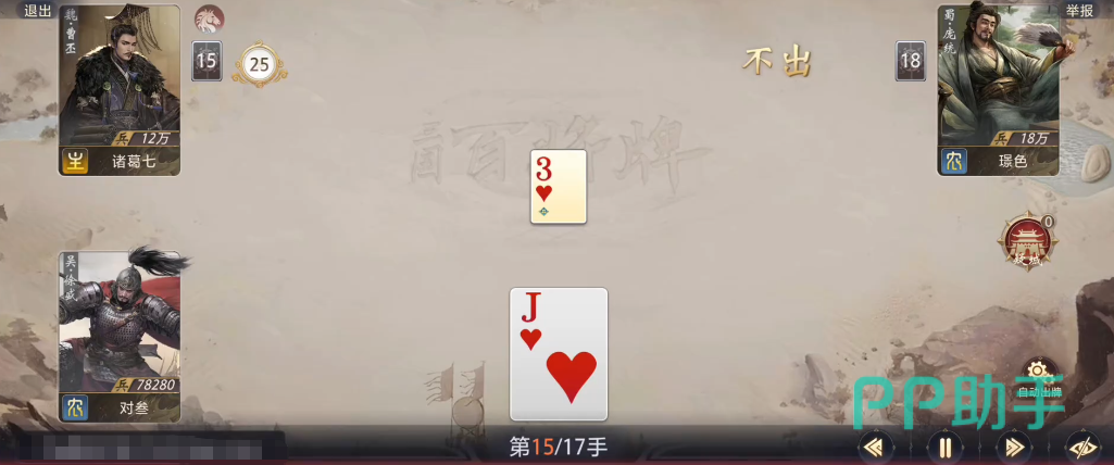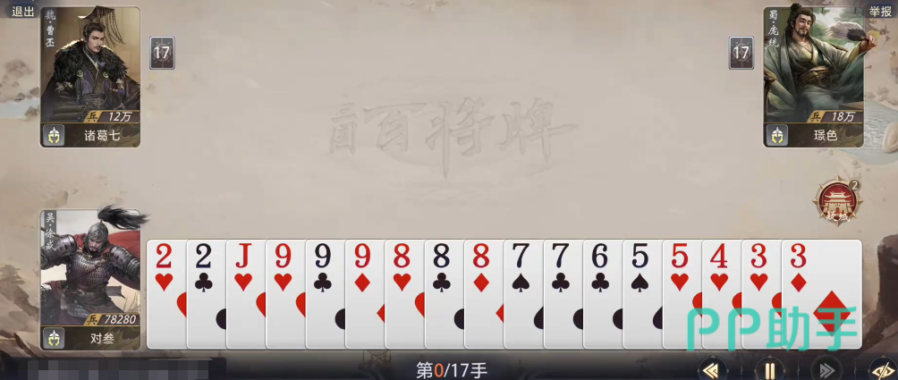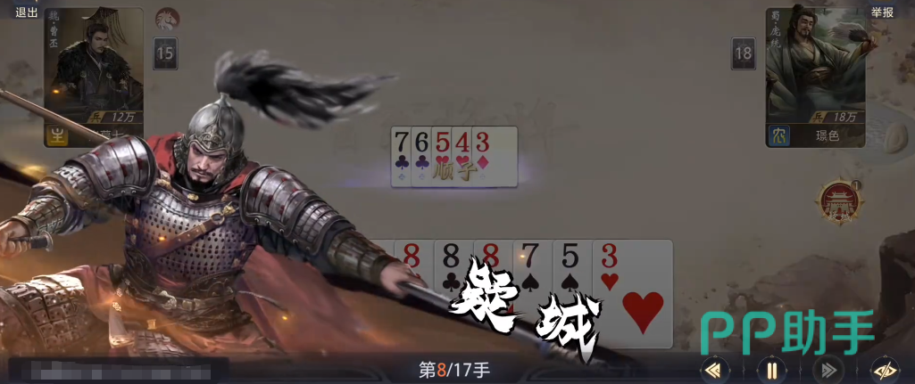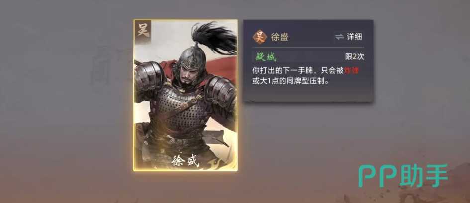 徐盛的核心技能名为“疑城”,每局最多可触发两次。该技能的关键在于后续打出的第一张手牌会自动转化为炸弹效果,这一机制在关键时刻极具威慑力。尤其当对手手中剩余牌数较少、局势趋于明朗时,使用“疑城”往往能直接改变战局走向。因此,合理规划技能释放节点,是发挥徐盛真正实力的前提。