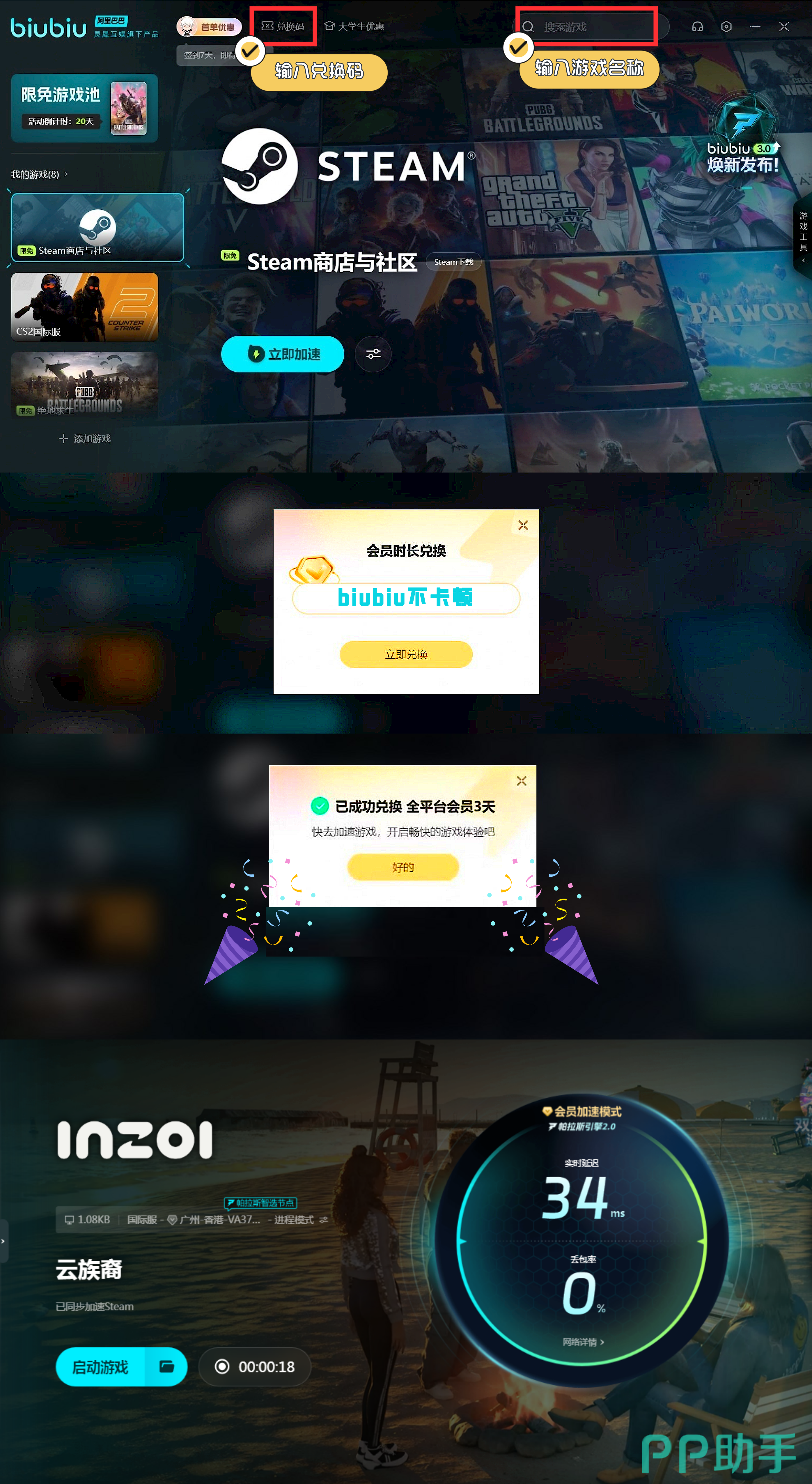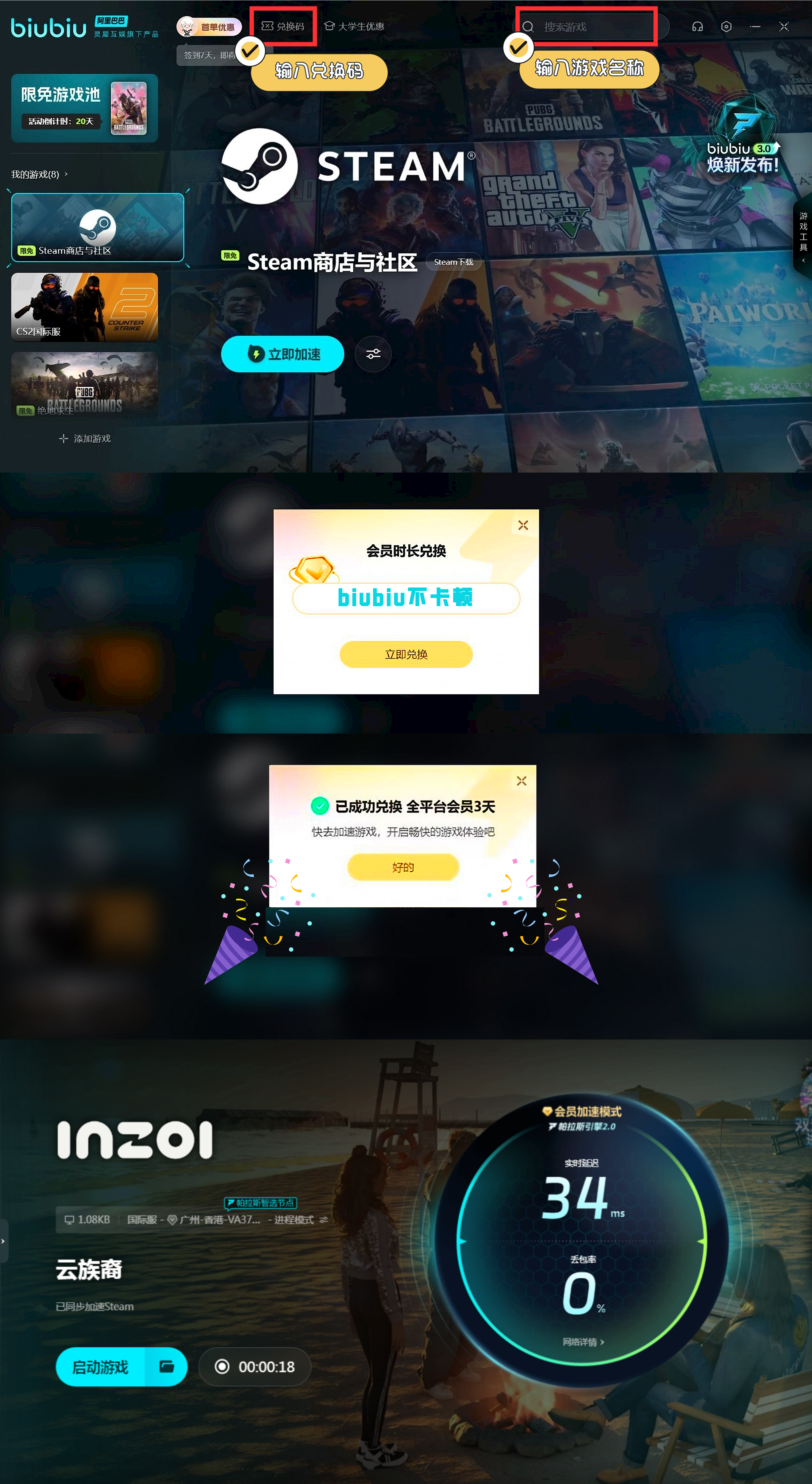 此外,biubiu还给大家提供了很多其他的福利,比如新用户会有3小时的免费加速时间,后续如果小伙伴们还想玩游戏,还可以继续使用biubiu不卡顿获得三天的加速时间。