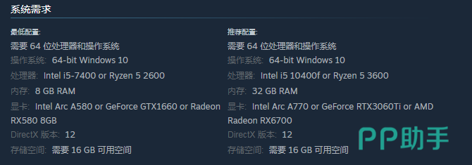 操作系统可以选择64-bit Windows 10,处理器方面也有两个选择,玩家可以选择Intel i5-7400 or Ryzen 5 2600,除此之外,玩家也可以注重于显卡的选择,可以考虑Radeon RX580 8GB。