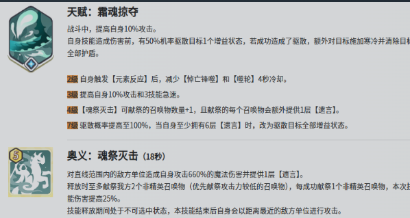 天赋【霜魂掠夺】是其压制逻辑的核心枢纽:基础提供10%攻击力加成;技能命中时有50%概率驱散目标一项增益,并附加寒冷效果、清除护盾;升至7级后驱散成功率提升至100%;集齐6层【遗言】层数即可驱散目标全部增益状态。该机制对依赖多重Buff维持强度的敌人形成显著克制。此外,触发元素反应可缩短核心技能冷却时间,大幅强化其在元素队中的协同效率。满好感度可解锁专属剧情动画,满足收藏向玩家需求。