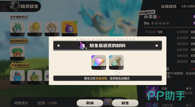 如果其中有一些精灵是大家不需要使用的,就可以选择放生,通过放生之后就可以获取资源。而这些资源在后期就可以带来较好的发展,在放生之后,玩家所获得的资源可以让玩家在后期拥有较好的辅助效果。