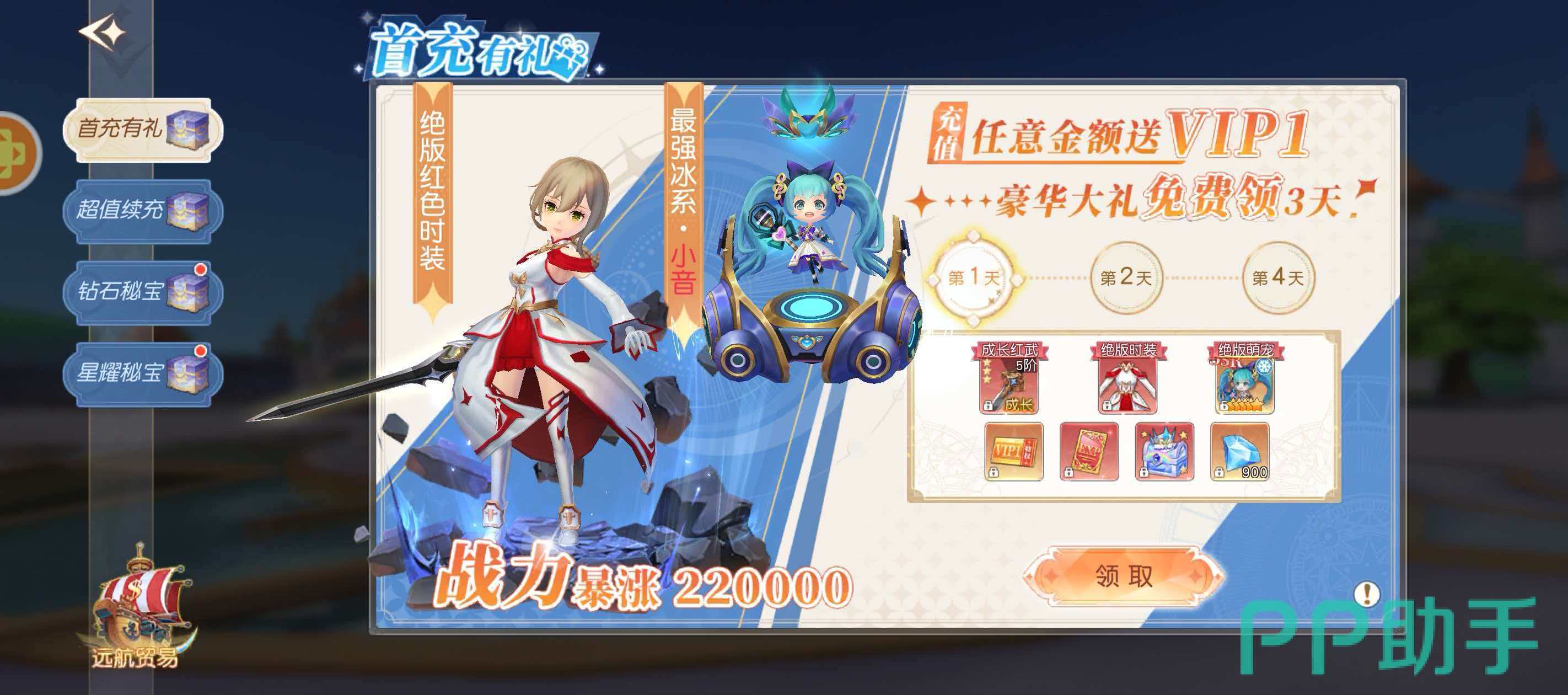 首次充值即触发专属福利体系:无论选择任意金额档位,均可即时激活VIP1身份,并解锁连续3日豪华成长礼包。首日奖励包含1件可进阶红武装备与1套绝版主题时装,同步附赠1只限定萌系灵宠。该活动为一次性资格,仅限账号首次充值生效。