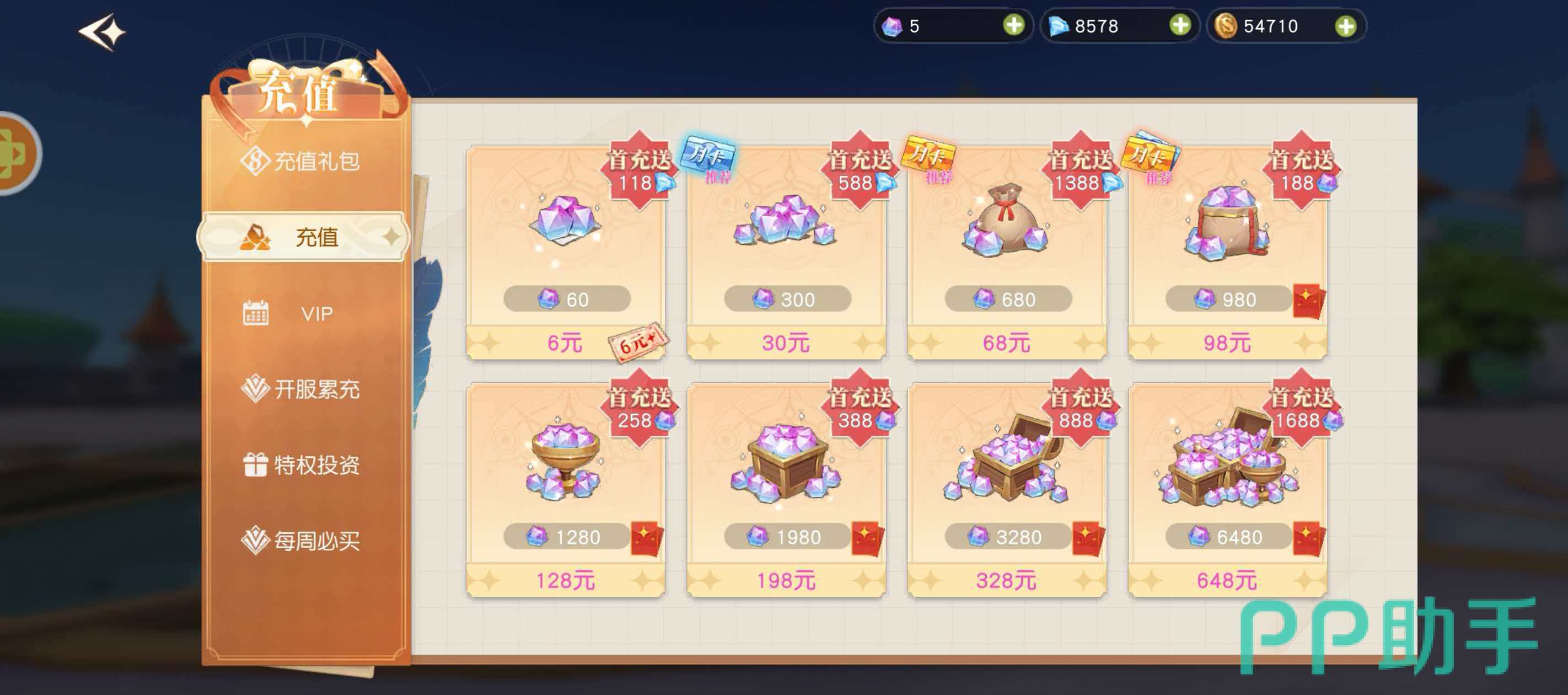 基础充值按1:10比例兑换彩钻(即1元=10彩钻)。其中6元、30元、68元三档设有蓝钻叠加奖励:6元档除60彩钻外另赠118蓝钻;30元档得300彩钻+588蓝钻;68元档获680彩钻+1288蓝钻。其余档位如128元、328元、648元等仅发放彩钻,其中648元档额外赠送1888彩钻,为当前单笔最高返还额度。