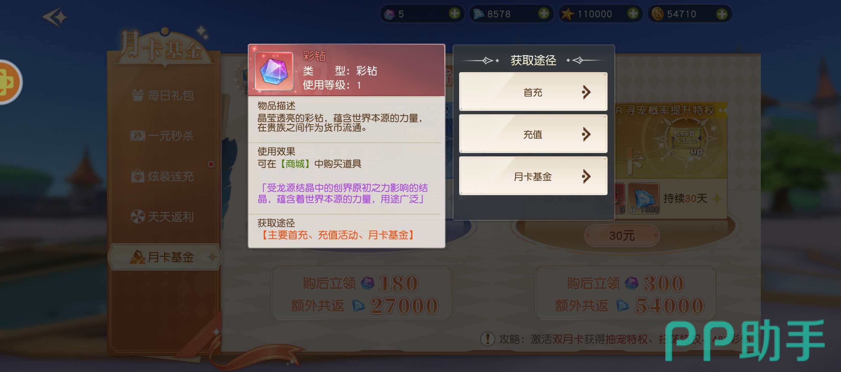 面向轻度付费用户的最优解方案。畅销月卡售价18元,开通即领180彩钻,并分30日返还总计27000蓝钻;尊贵月卡定价30元,开通当日到账300彩钻,累计返还54000蓝钻,且每日额外提供3枚灵宠之魂。两项月卡均支持自动续订,权益持续生效至服务期结束。