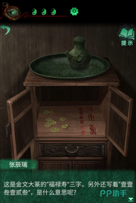 玩家在遇到棺材这个谜题的时候,已经来到第三关最后尾声的部分。到院子之后,首先玩家要点击右边的柜子进行寻找线索,这个地方非常关键。在这里玩家会看到用金文写的福禄寿三个字,并且在旁边还写着113123的数字。这个线索玩家要记住是玩家在后续打开关材的重要钥匙。