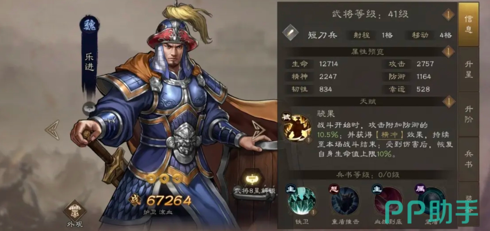 先来说说前期的情况,在游戏前期,有一个公认的好用小肉盾,那便是乐进,乐进的优势十分明显,他拥有受击回血的能力,生存能力极强,而且他的升星难度较低,非常容易养成,对于新手玩家来说是比较实用的武将,能够为队伍稳稳地扛住伤害,直到大家主力输出达到12星以后,此时可能就不再那么需要坦克了,但在此之前乐进堪称前期性价比最高的武将之一。