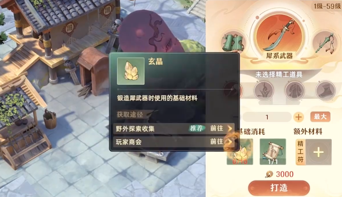 战力进阶的核心环节在于装备打造。前往锻造屋,可制作武器、帽子、衣服与鞋子四类装备。不同部位所需材料与图纸各异:材料可通过商会兑换或野外宝箱获取;图纸固定产出于证道阁,每次战斗胜利均有概率掉落;精工符则需在丹道室炼制,用于锻造时提升成品品质。装备打造等级可在界面右上角直接切换。