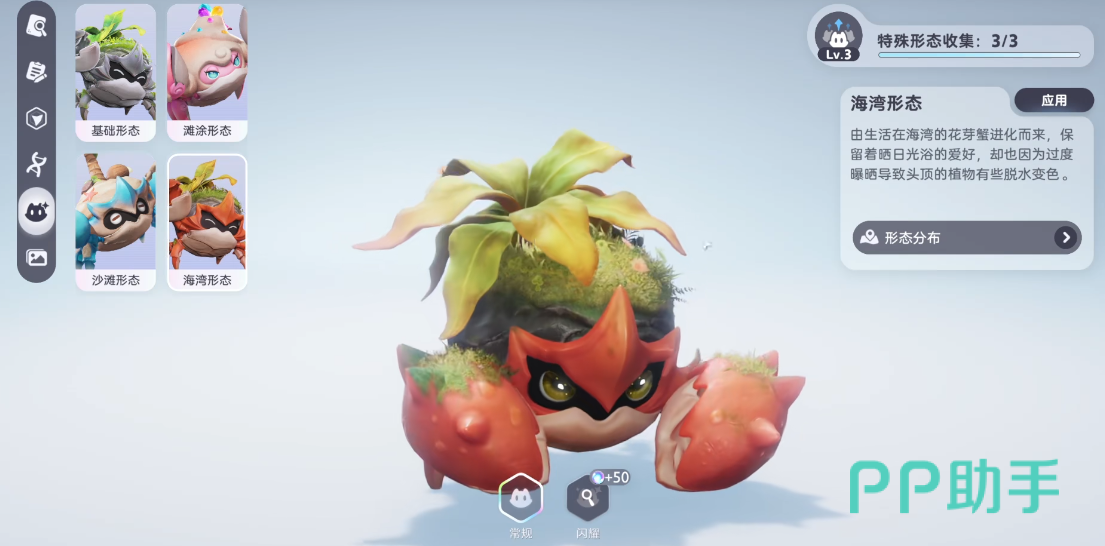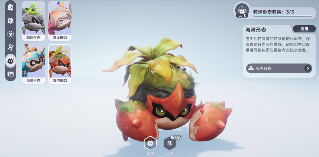 除基础形态外,花芽蟹共存在三种环境特化形态:滩涂形态、沙滩形态与海湾形态。其中,滩涂形态仅分布于湘花岸区域;沙滩形态稳定刷新于鲸落浅滩;海湾形态则限定出现在欧鸣湾水域周边。三者均需玩家在对应地理环境中主动探索并完成捕捉操作方可获得。