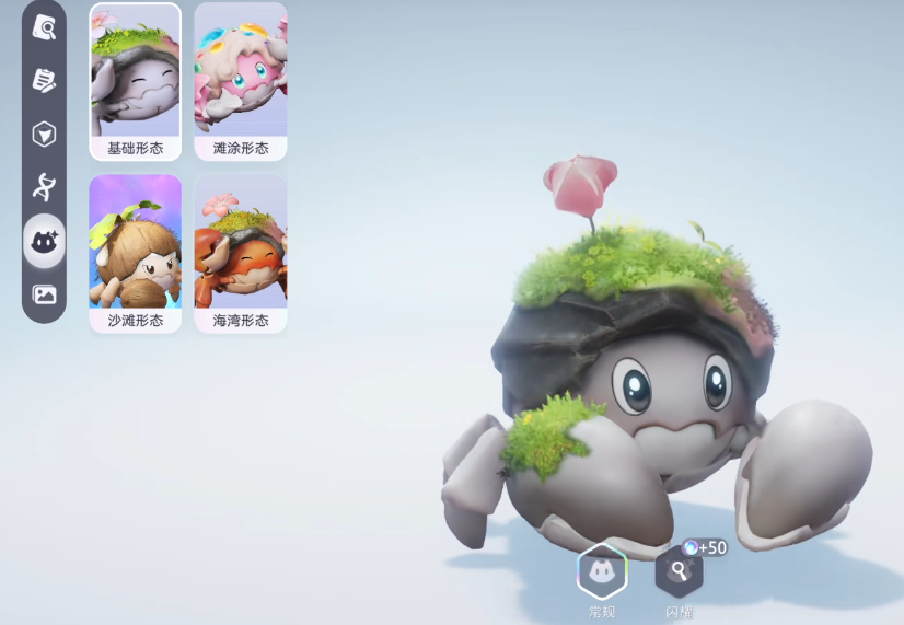 当花芽蟹完成首次进化后,将转变为蟹葱葱形态。该阶段同样延续环境分化设定,包含滩涂、沙滩、海湾三种对应形态。值得注意的是,未受环境影响的普通(基础)蟹葱葱反而较为稀有,推荐优先前往潮花岸区域进行集中搜寻。