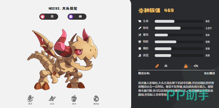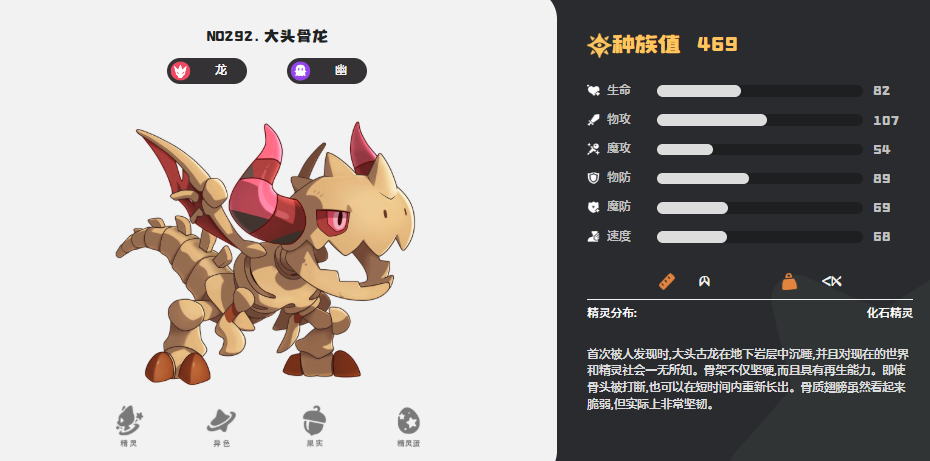 虽然大头骨龙在战斗阵容中出场率不高,但它在探索模式下的表现极为亮眼。作为一只龙系精灵,它具备强大的地形穿越能力,常被用作陆地坐骑,支持高速移动,便于在不同区域之间快速切换。此外,它还拥有跳跃技能,落地时不损耗角色生命值,特别适用于高低落差较大的地形环境。尽管其体型较大,在狭窄空间可能存在通行限制,但即便不进行进化,依然能在中后期持续发挥作用,实用性较强。