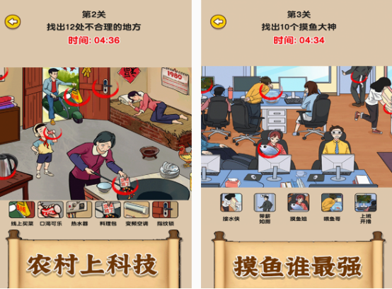在这款更是充满着年代感的找茬游戏中,也能看到与场景不合理的地方,同样也是有规定时间限制的,只有在规定的时间内,找到所具备的多处不同之处,才能进入下一个关卡。无论是在现代化的画面当中,还是在以80后90后小的时候生活的场景为主,都会有一些不符合图片年代的物品,考验玩家的眼力以及智慧,拥有的场景非常丰富。