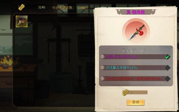 锻造界面分为装备打造、属性重铸打造新装备时,选择与角色职业匹配的配方,像是关于堆暴击,而一些方士职业可以堆谋略,消耗材料后概率产出不同品质装备,失败时积累可保底获得紫色以上品质。属性重铸允许调整装备副属性,建议将暴击率、攻击力等核心属性锁定后反复洗练,直至达到理想数值。