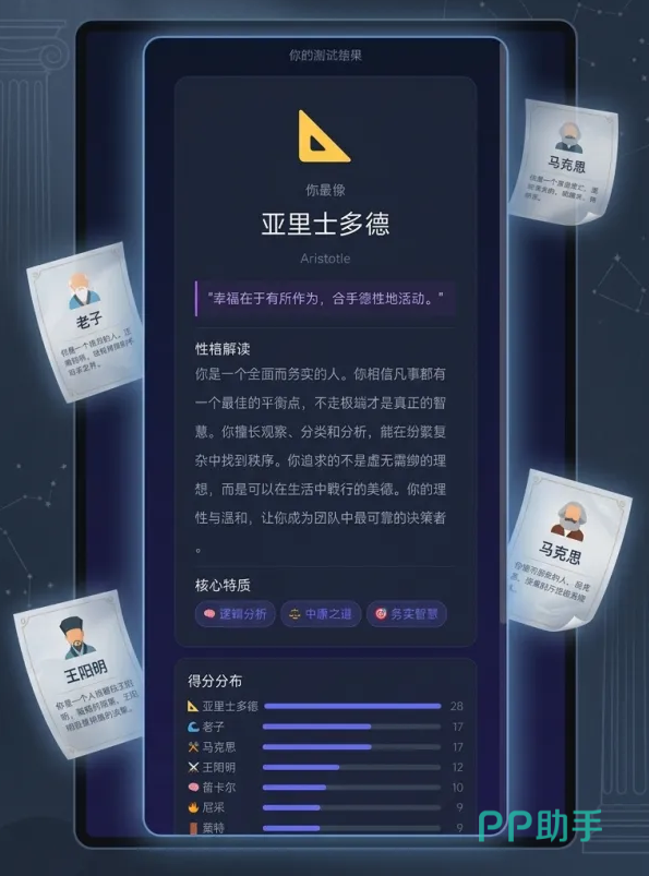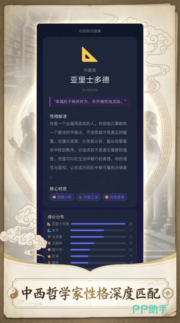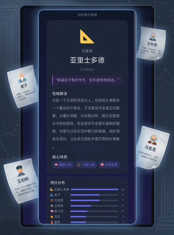 题目设计注重生活化与代入感,无专业门槛,无需哲学基础,所有选项均基于真实心理倾向建模。玩家只需依本心作答,系统将依据多维人格维度分析,输出匹配度最高的哲学家形象,并附带简明易懂的性格解读,帮助用户从另一个角度认识自我。