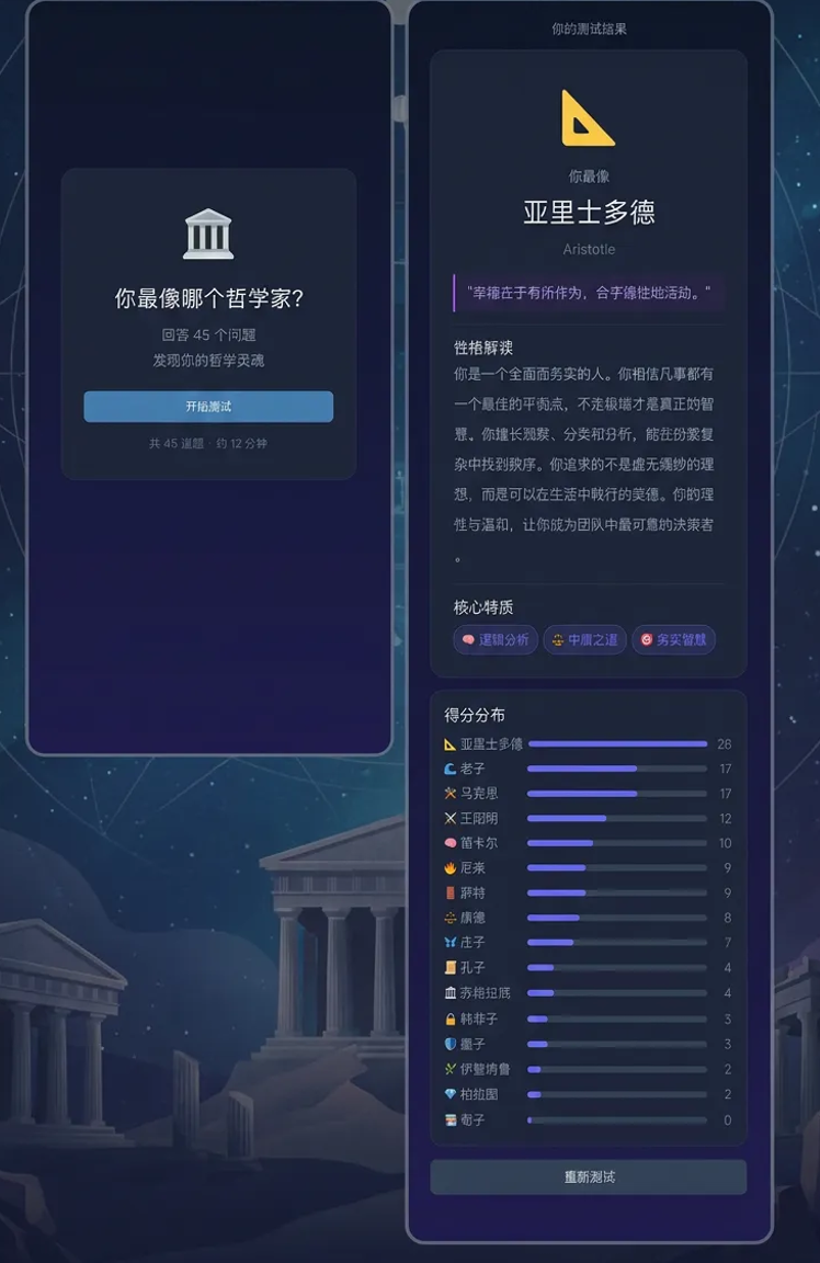 当前版本涵盖东西方代表性思想家共十余位,包括亚里士多德、马克思、老子、王阳明、尼采、莱特等,时间跨度覆盖古代至近现代,兼顾文化多样性与思想典型性,确保匹配结果兼具深度与广度。