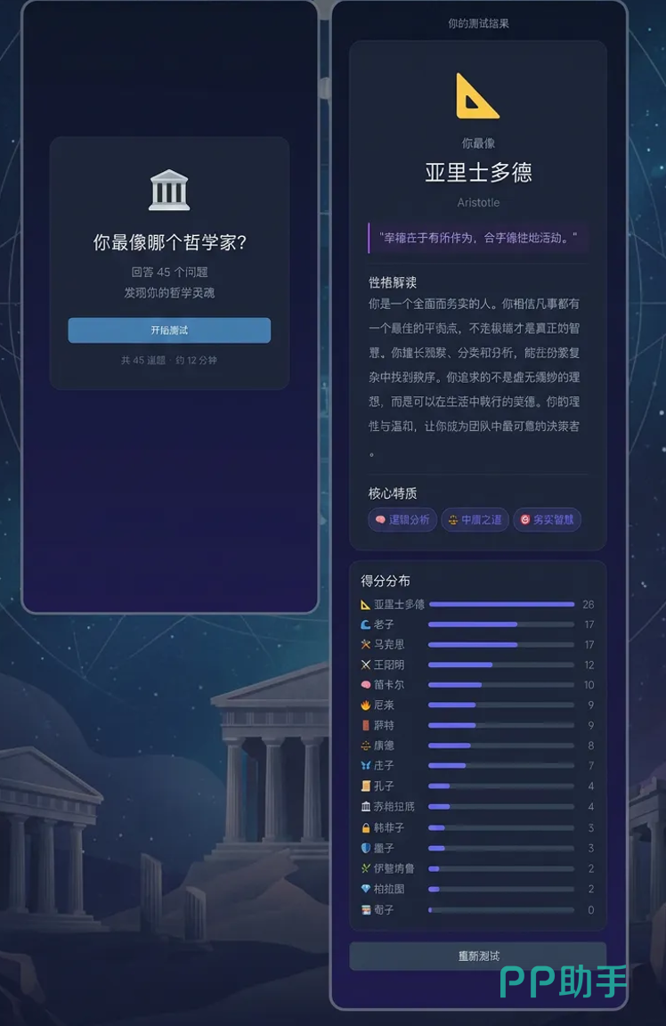 你最像哪个哲学家手游好玩吗?如果你平时偏好轻松有趣、富有思辨趣味的休闲体验,这款以哲学人格测评为核心的互动游戏或许正合你意。它不依赖操作技巧,也不设置战斗关卡,而是通过一系列精心设计的选择题,引导玩家在日常情境中做出直觉反应,最终生成专属的哲学家匹配报告——既揭示潜在的性格特质,也呈现对应哲学家的思想底色。