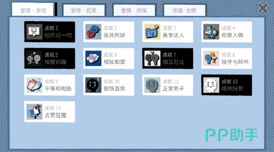 平等和相处也不需要小伙伴们的任何操作,直接在帮忙收拾的场景里点击垃圾就可以了,绝种好男需要大家通关完美结局才行,接着大家在游戏中完成分手结局就可以解锁直男癌晚期,没有完美结局也没分手就会达成正常男子成就,将第一章的每种结局都打通就可以获取经历过一切的成就,遥远,记忆成就需要大家在第二章的剧情中完美的将一系列选项进行正确的选择就可以获取了。