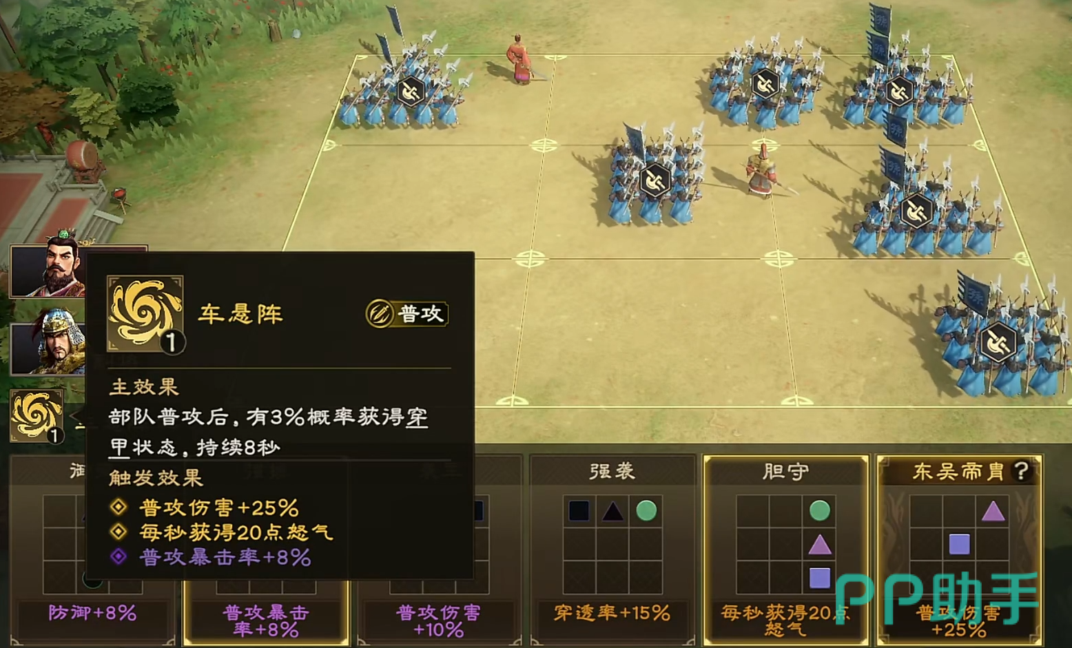 合理配置阵法能进一步激发孙策在普攻流阵容中的辅助效能。根据不同阶段的资源获取情况,应采取逐步进阶的方式进行阵法替换。开荒阶段推荐使用雁形阵,该阵法易于获得且专为普攻体系设计。其基础效果为提升全队暴击率,与孙策自身的暴伤增益形成良好联动。具体布阵建议为:励军(增伤)、先军(先手权)、制胜(暴击加成)、御策(技能抗性)。此组合兼顾输出与防御,适用于前期资源有限的环境。雁形阵的优势在于获取门槛低,即使非氪金玩家也能轻松集齐所需碎片。