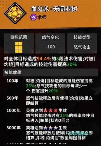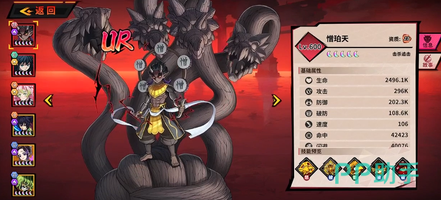 当前版本中,「憎珀天」为综合强度突出的推荐UR人选。其核心技能「血鬼术」可对全体敌人发动8段连续伤害,每段造成94.4%攻击力的法术伤害;若目标处于灼烧状态,则总伤害额外提升20%。击杀敌方单位后,立即释放一次怒气技,造成50%攻击力的范围伤害,且该怒气技在本回合内可使自身所有伤害提升3.5%(每回合仅触发一次)。凭借高覆盖率、强联动性与稳定的增伤循环,该角色在当前UR梯队中具备显著战术优势。