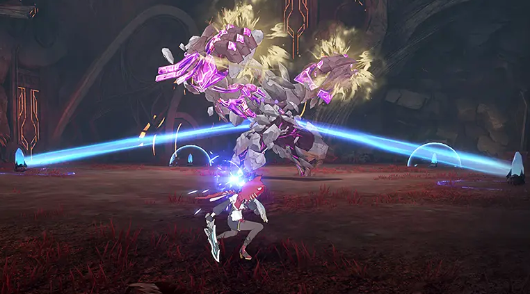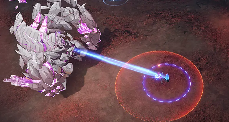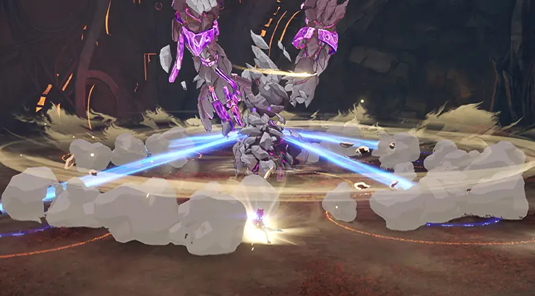 Boss标志性技能“碎地重拳”具有双重判定机制:首先锁定一台遗迹装置,随后在其周围展开矩形范围攻击,该区域伤害可由至少5名玩家分摊;若分摊人数不足,将触发防御崩溃机制,导致装置损毁。此外,受击玩家将被强力击飞,务必提前规划站位,利用地形高低差控制位移距离,防止坠落平台。