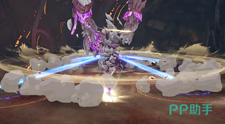 另一关键机制“裂石风暴”为旋转式沙尘暴技能,持续对全场玩家施加强制位移效果,部分区域位移力度足以将角色推出平台边界。应对策略为:全员迅速向最近遗迹装置靠拢,并进入其投射的蓝色加速圈内,借助移速加成主动迎向Boss,以对冲方式抵消推力;若场地存在石柱或断壁等遮挡结构,可合理卡位规避失控风险。