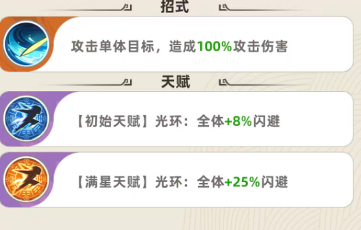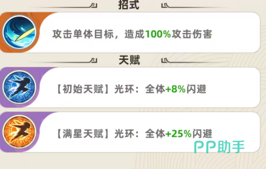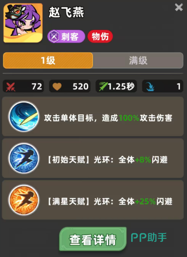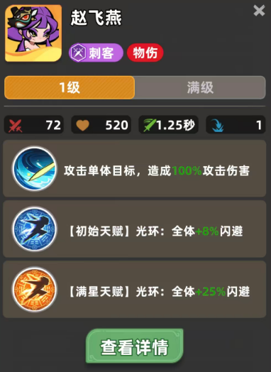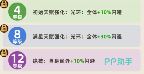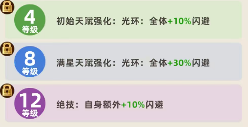 赵飞燕的核心价值在于其天赋光环——“轻羽闪袭”。该效果不绑定职业限制,可无差别作用于全体己方单位:初始即提供8%全局闪避率;升至4级时提升至10%;达成满星(8级)后进一步强化至30%闪避;若继续培养至12级,还可额外叠加10%,最终实现最高40%的全队闪避覆盖率。这一机制显著区别于多数仅增益同职业单位的被动技能,使其成为跨体系兼容性极强的功能型英雄。