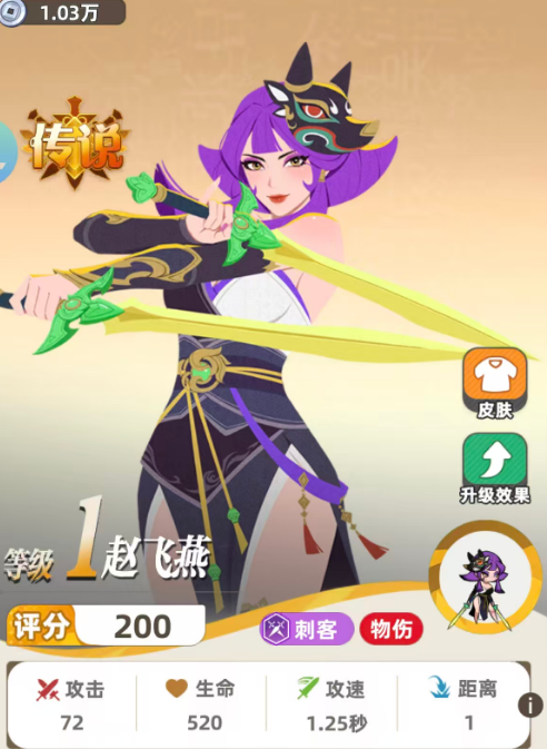 赵飞燕属于刺客职业,初始定位为单体物理输出型单位。其普攻无额外特效,仅执行标准100%基础伤害判定,因此不依赖技能联动或状态叠加,更适合作为稳定站场的前排切入手。由于自身输出成长曲线平缓,单独培养难以承担主力C位职责,推荐将其纳入以刺客为核心的职业羁绊阵容中,通过羁绊加成放大生存与持续作战能力。
