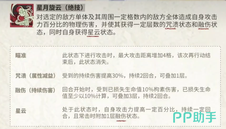 星月夜的绝技“星月璇云”则是她爆发伤害的核心所在。她会对选定的单体目标及其周围的敌人造成大规模的物理伤害,此外,还会附带两种独特的负面效果——“咒溃”和“融伤”。其中,咒溃让敌人持续承受额外的伤害,且持续2回合;融伤则让敌人受到已损失生命值10%的构素伤害,并且最多能叠加3层。这样一来,星月夜的爆发不仅可以打出高额的单体伤害,还能对敌人造成持续性的伤害压力。