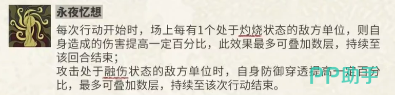 另外,星月夜的另一项被动技能也非常有趣。在每回合开始时,如果场上有敌人处于灼烧状态,她的伤害会得到提升,且这个加成可以随着灼烧状态的敌人数量叠加。与此同时,攻击融伤敌人时,星月夜的防御穿透也会得到一定的增强。这样的机制不仅让她的伤害在敌人状态变化时得以提升,还能在对付高防御敌人时更具威胁。
