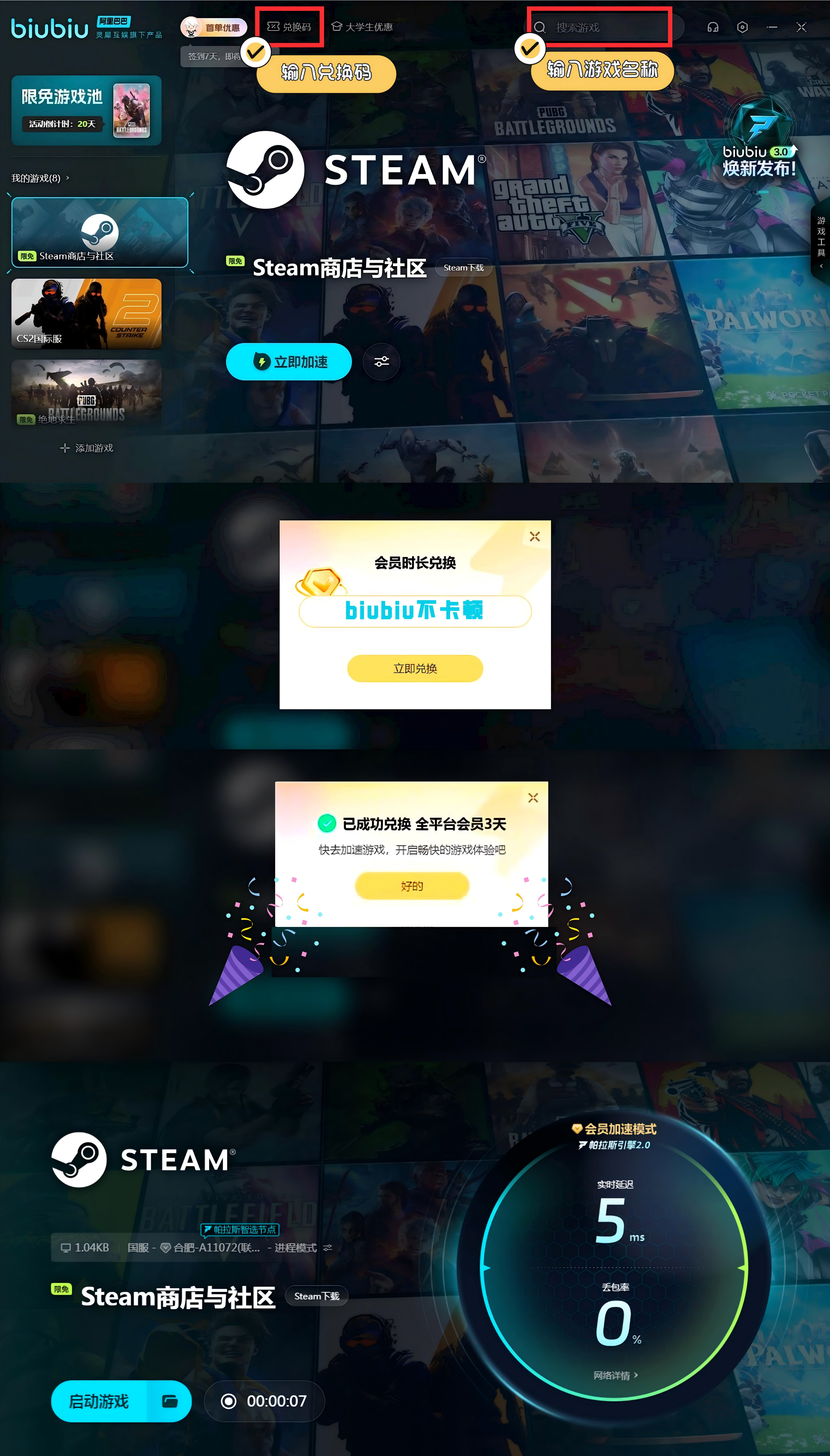 首先是新用户只要完成注册,就可以拿到3小时的服务时间,其次就是【biubiu不卡顿】的活动仍在持续当中,使用之后可以兑换到额外的72小时服务时间哦,最后给新人用的其实就是75小时免费服务时间了,简直是太棒了。整个使用期,链接steam都没什么问题的。
