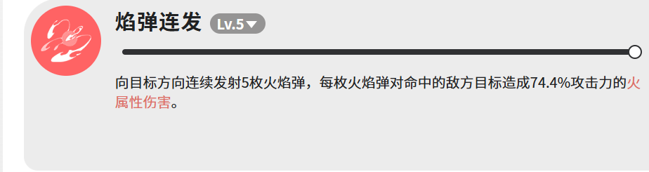 “焰弹连发”为高频压制型技能,朝指定方向连续发射5枚火焰弹,每枚独立命中可造成74.4%攻击力的火属性伤害。五发全中理论总倍率为372%,适用于快速清理低韧性杂兵或衔接控制空档,兼具稳定性与覆盖率优势。