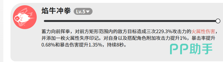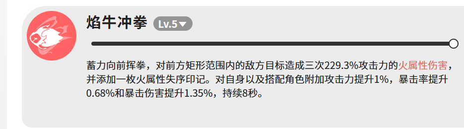 焰牛牛共配备四项主动技能,其中“焰牛冲拳”为核心输出兼团队增益技。升至Lv.5时,完成蓄力后向前发动三段式矩形范围拳击,每段造成229.3%攻击力的火属性伤害,并在命中目标后附加一枚火属性失序印记。此外,该技能同步激活自身与编队内所有角色的增益状态:攻击力+1%、暴击率+0.68%、暴击伤害+1.35%,持续时间8秒。虽单层增幅数值温和,但在多角色协同作战场景中具备可观的叠加价值与节奏支撑能力。