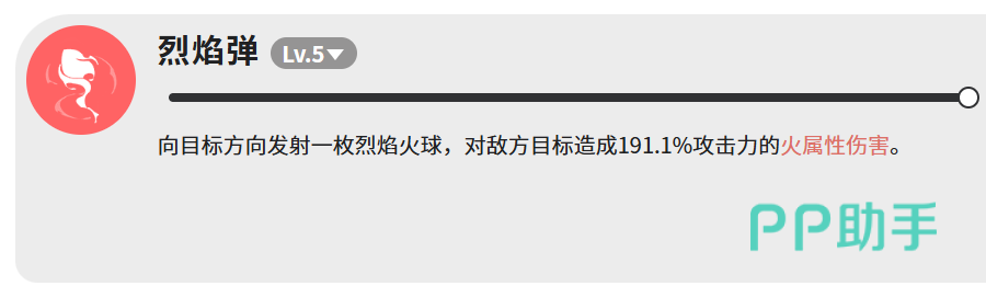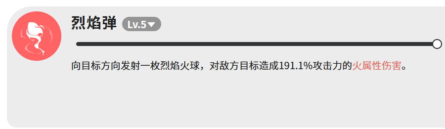 “烈焰弹”属于高集中度单体打击技,投射一枚大质量火球,命中后造成191.1%攻击力的火属性伤害。其倍率在同级单点技能中处于上游水平,适配Boss战、精英单位攻坚等强调精准输出的战斗环节。