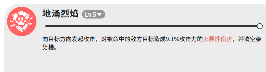 “地涌烈焰”为功能性核心技,表面伤害倍率仅9.1%,但实际作用在于强制清空目标架势槽。成功触发后,敌方将陷入破防状态,此时任意后续攻击均可获得显著伤害加成。该技能不以直伤见长,而是作为整套连招的启动锚点,承担承上启下的战术枢纽职能。